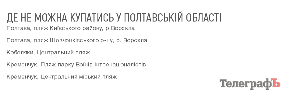 По версии Министерства здравоохранения Украины (МОЗУ) в Кременчуге опасно купаться на Центральном пляже, и на пляже в парке Воинов-интернационалистов. Вода там не соответствует санитарным нормам.