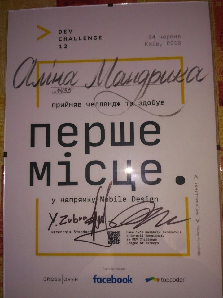 Дизайн мобильного приложения Алины оценили судьи и девушка стала лучшим mobile-дизайнером чемпионата в категории standart, с чем её и поздравляем.