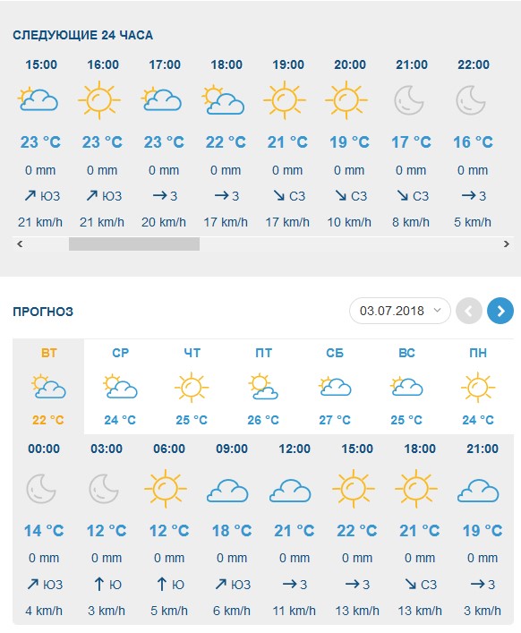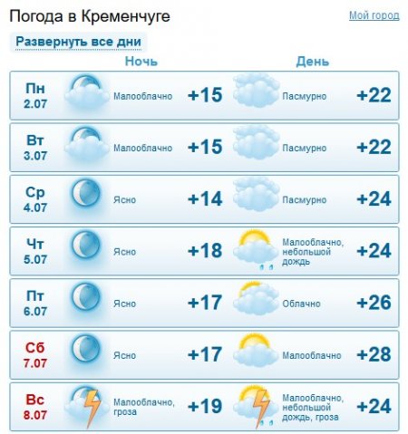 Gismeteo прогнозує невеликий дощ у четвер, 5 липня, та справжнісіньку грозу у неділю, 8 липня. В усі інші дні - суху та похмуру погоду. Стовпчики термометрів вночі не опускатимуться нижче позначки у +14°C, та не подолають відмітки +28°C вдень.
