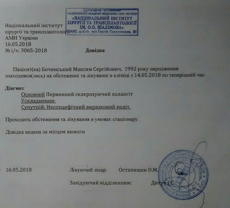 – Молодого хлопця зненацька застав страшний діагноз: первинний склерозуючий холангіт, зараз йому потрібна термінова пересадка печінки! Допомогти йому беруться в Києві, в Інституті хірургії та трансплантології ім. Шалімова та вартість такої операції 50 тис. долларів. Така сума є непід’ємною для нашої родини. Допомоги чекати немає звідки, тож ми сподіваємось тільки на небайдужих людей.