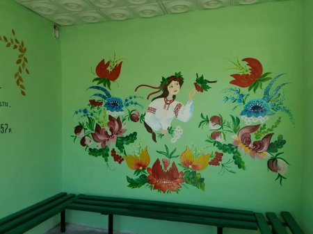Одну зі стін прикрашає зображення україночки у квітковому вінку, який виконали в стилі петриківського розпису.