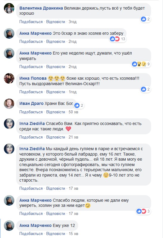 Виявилось, що у «Спецсервісі» не дарма вірили у порядність господарів. Буквально на наступний день після публікації посту, у коментарях під ним Анна Марченко написала, що пес - домашній, його звуть Оскаром і йому 12 років. Господарі тиждень шукають Оскара і вже вирішили, що пес пішов з дому помирати... Анна подякувала небайдужим, які не кинули собаку в біді й повідомила, що господарі уже їдуть за плеканцем.