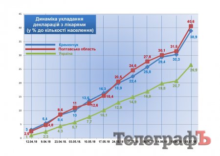 И Полтавская область, и Кременчуг показали более высокие результаты подписной компании, чем те, что зафиксированы по Украине в целом. На 6 июля в стране подписали декларации с семейными врачами 26,5% населения. На одного среднеукраинского врача приходится 562 подписанных декларации.
