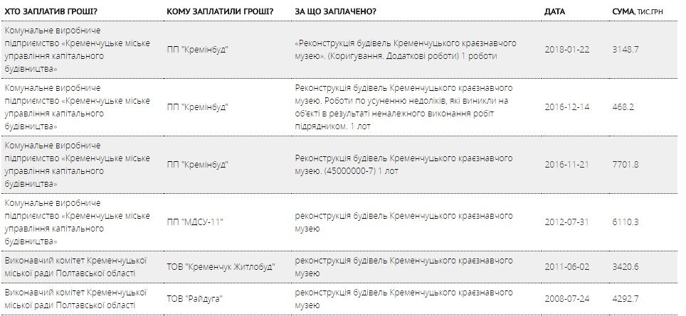 C помощью ресурса Zакупівлі (z.texty.org.ua), где собрана полная база о тендерных закупках с 2008 года, мы можем проследить всю долгую тендерную историю реконструкции музея и подрядчиков. ЧП «Креминбуд» уже четвертый (кликните для увеличения).