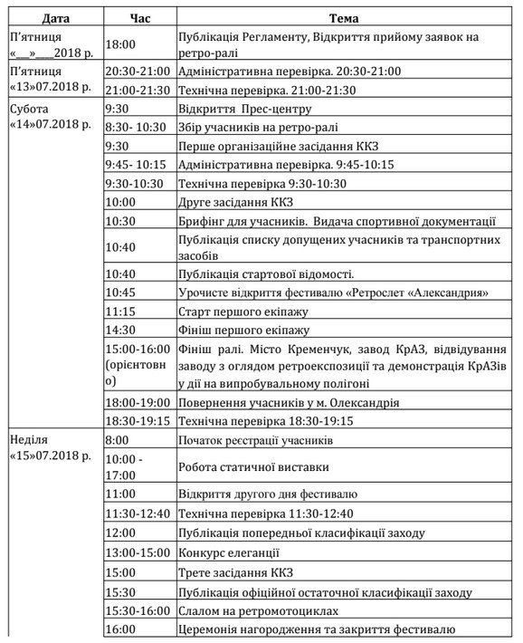 У перший день проведення, 14 липня, заплановане класичне ралі на ретроавтомобілях Олександрія – Кременчук. Фінішують учасники на заводі «КрАЗ». Як повідомляють організатори «Ретрозльоту «Олександрія», фініш попередньо намічений на 14.00 – 14.30. Інших зупинок по місту поки не заплановано.