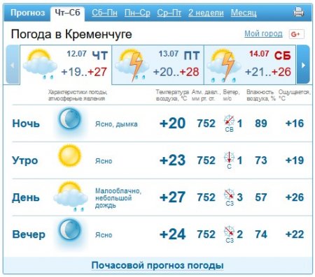 Попередження про погіршення погодних умов є також на Sinoptik. Тут кременчужан також попереджають про можливу грозу та короткочасне шквалисте посилення вітру до 15-24 м/с. Хмарний день та похмурий вечір прийдуть на зміну ясному ранку. Удень і ввечері буде йти дрібний дощ. Також Sinoptik обіцяє грози і у п'ятницю, 13 липня, і у суботу, 14 липня.