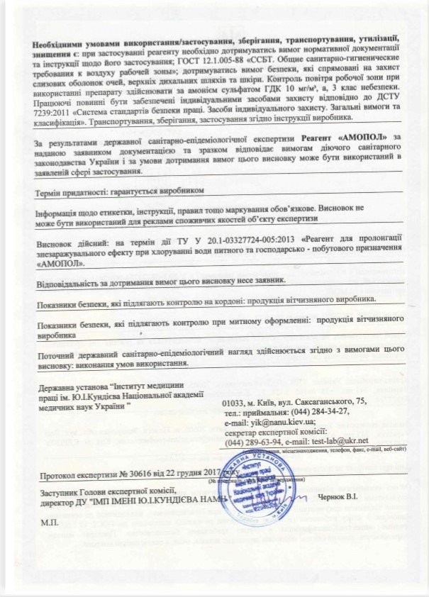 Все документы на реагент водоканал предоставил. Констатируем: Госпродпотребслужба признала, что реагент для пролонгации обеззараживающего эффекта «Амопол» отвечает требованиям санитарного законодательства и может быть использован в питьевом водоснабжении. Реагент отвечает установленным критериям медицинской безопасности. Меры безопасности должны принимать те люди, которые работают с сухим веществом.