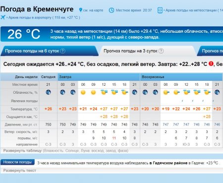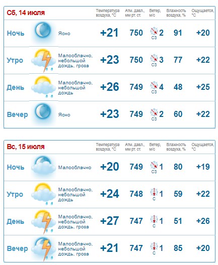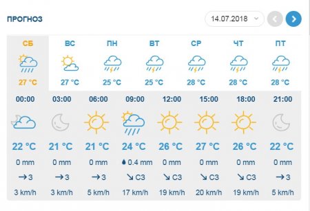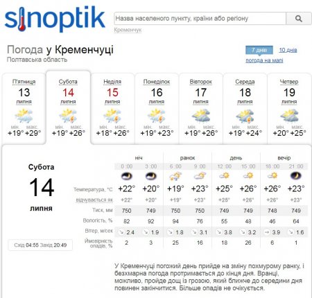Rp5 навпаки на суботу, 14 липня, жодних опадів не прогнозує, але попереджає про посилення поривів вітру до 11 м/с. У неділю, 8 липня, після обіду почнеться злива. Температура повітря коливатиметься в межах +19°C...+27°C.