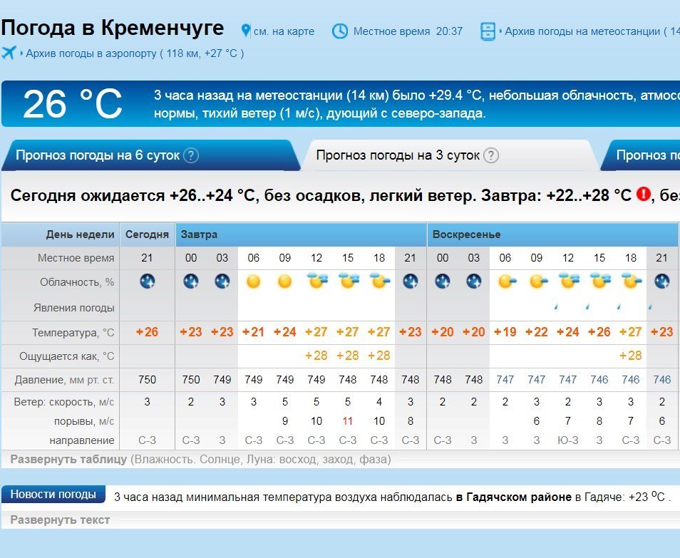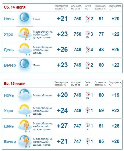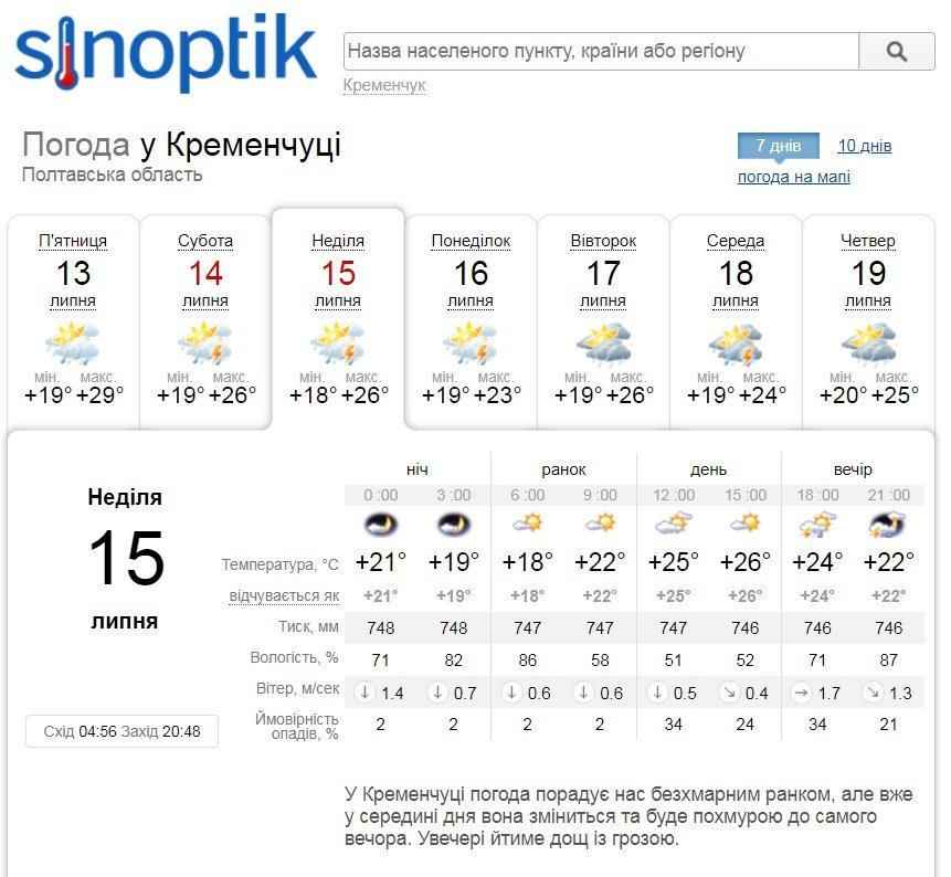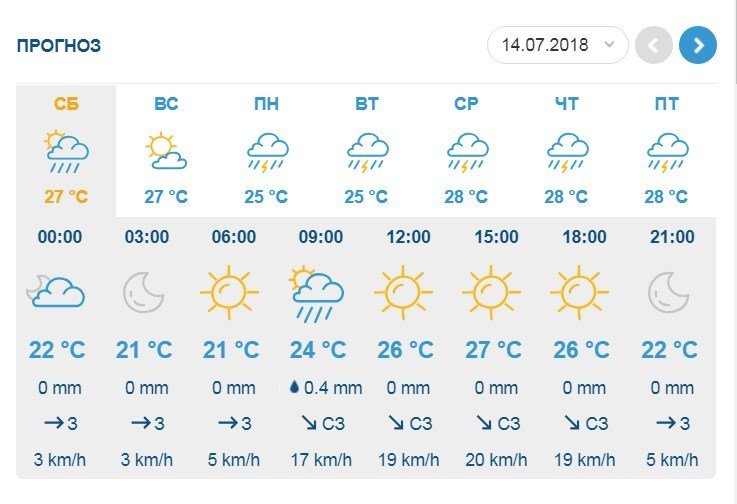 Rp5 навпаки на суботу, 14 липня, жодних опадів не прогнозує, але попереджає про посилення поривів вітру до 11 м/с. У неділю, 8 липня, після обіду почнеться злива. Температура повітря коливатиметься в межах +19°C…+27°C.