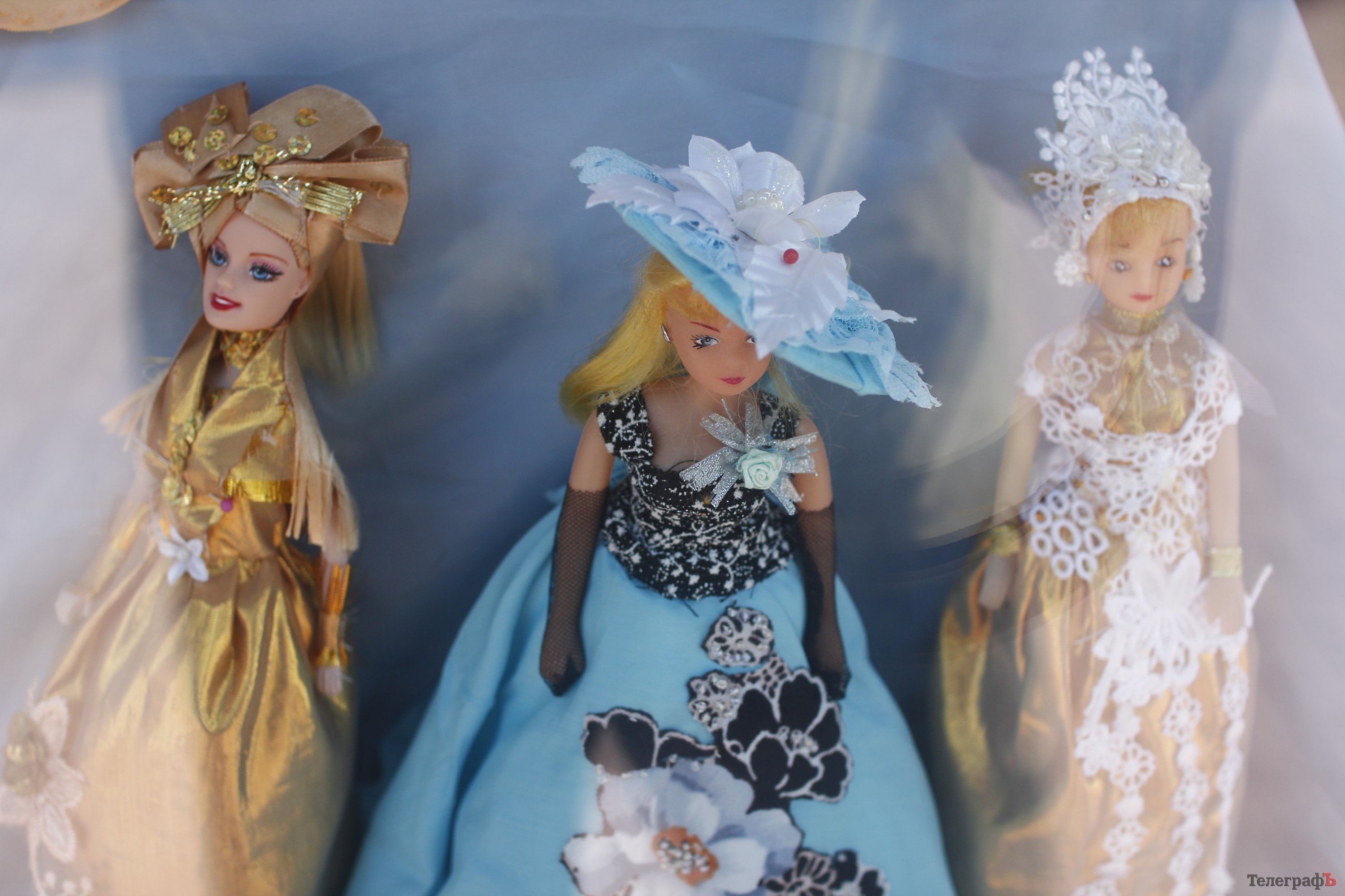 Кукольные платья выполнены из очень качественных тканей. Многие годы обрезки этих тканей приносили Гугниной соседки – мать и дочь, всю жизнь шившие свадебные платья. Соседок этих уже нет в живых. А кукол, одетых в бальные платья, сшитые из дорогих свадебных тканей, сегодня можно увидеть в витрине Центральной детской библиотеки.