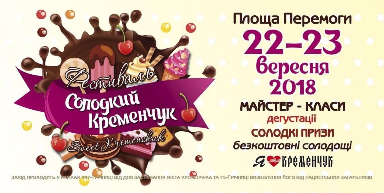У рамках святкування 447-ї річниці з Дня заснування міста та 75-ї річниці його визволення від загарбників у Кременчуці відбудеться всеукраїнський фестиваль солодощів «Солодкий Кременчук», на якому будуть презентувати, готувати, куштувати і оцінювати смачні вироби.