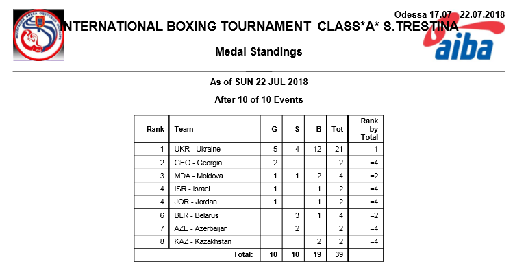 Перше загальнокомандне місце посіли представники збірної України, які здобули 5 золотих, 4 срібних та 12 бронзових нагород. Друге та третє місця закріпили за собою команди Грузії та Молдови відповідно.
