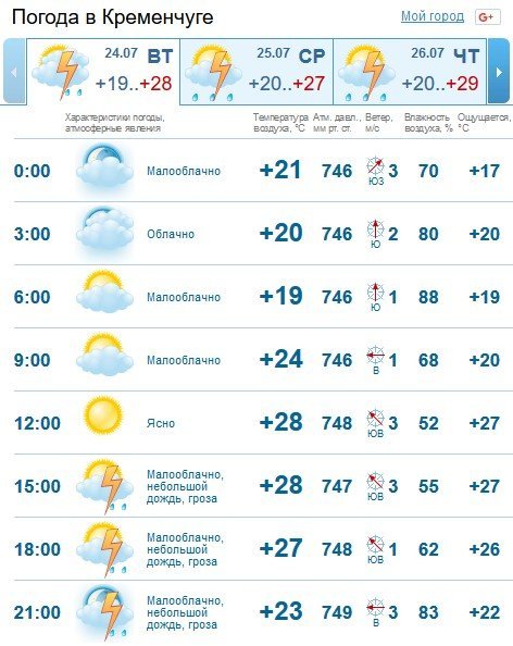 Попередження про погіршення погодних умов є також на Sinoptik. Тут кременчужан також попереджають про можливу грозу та короткочасне посилення вітру після 15.00. Також Sinoptik обіцяє грози і у середу, 25 липня, і у четвер, 26 липня.
