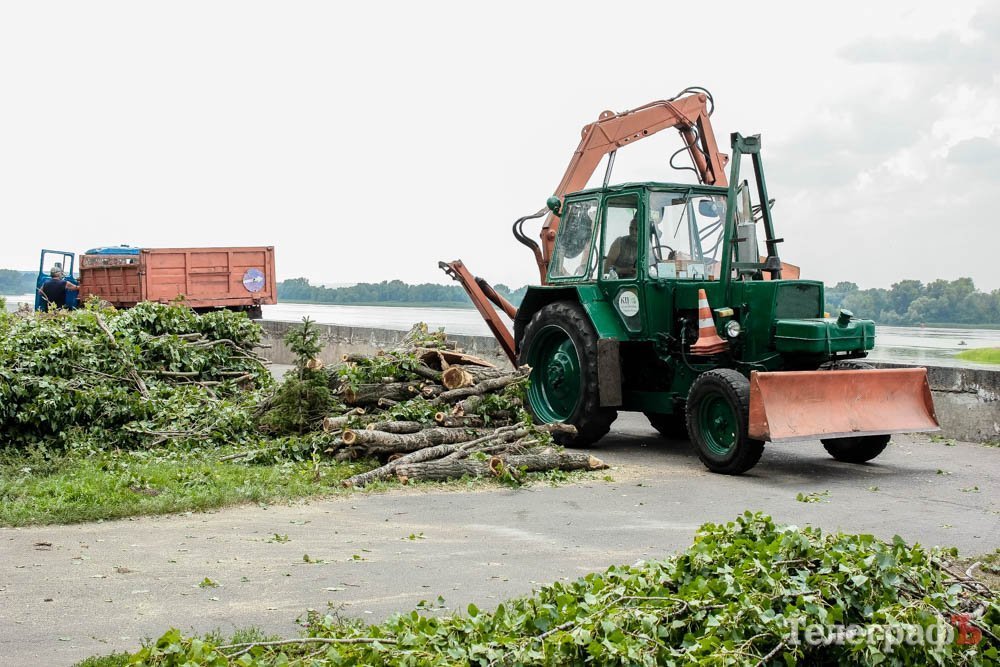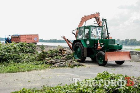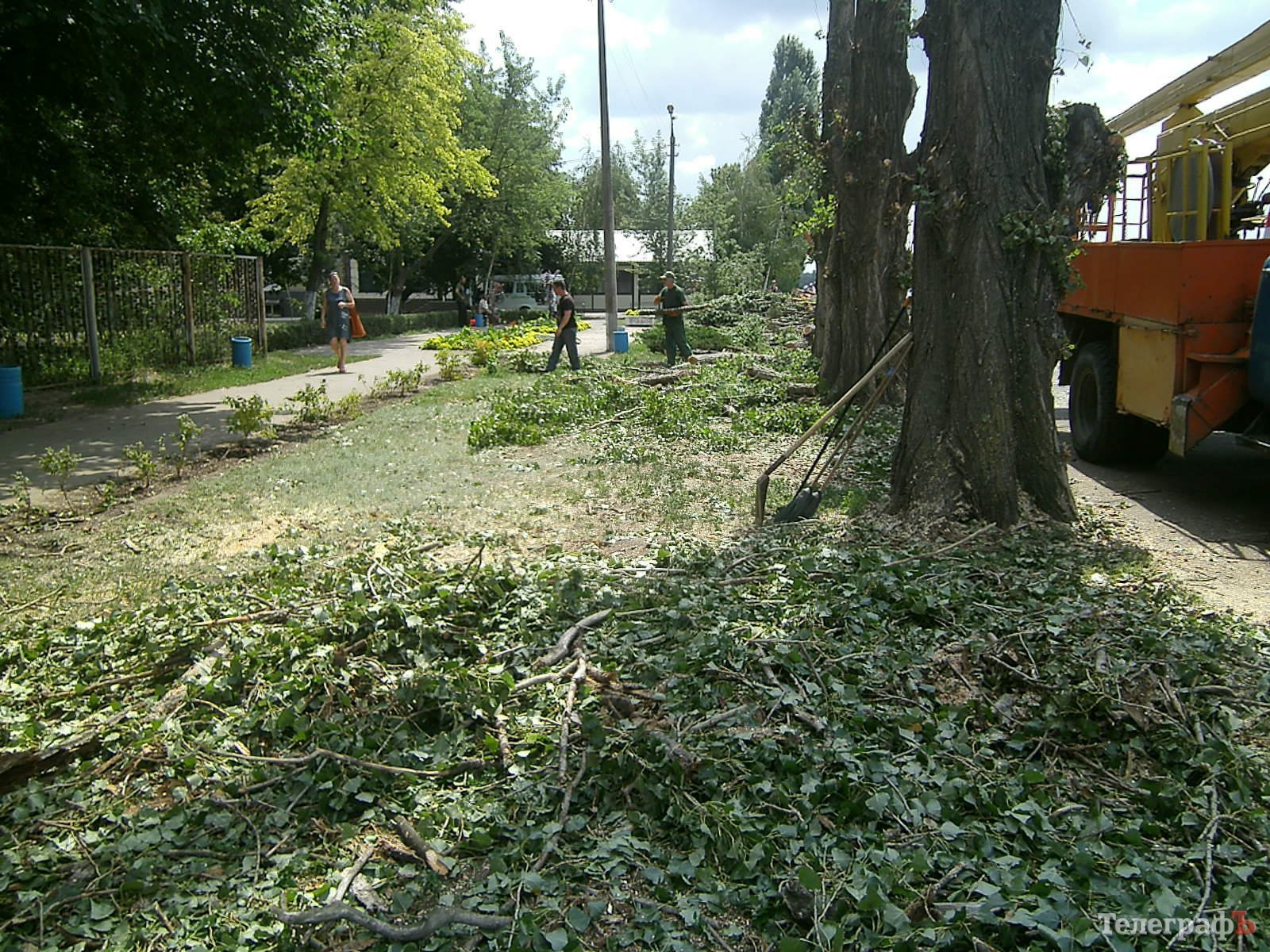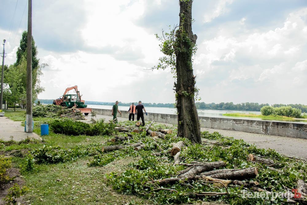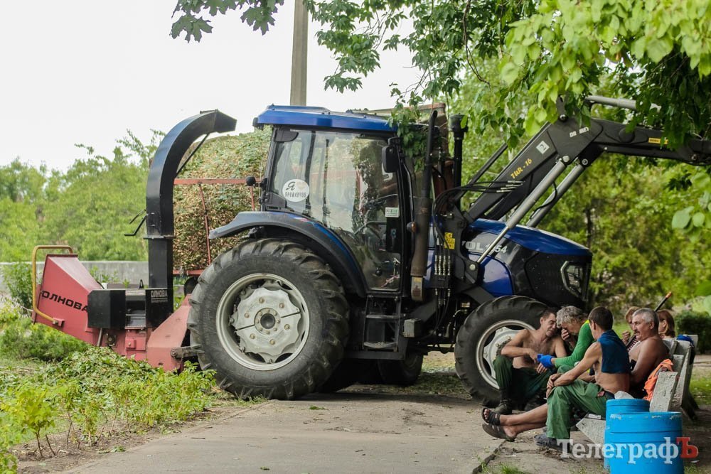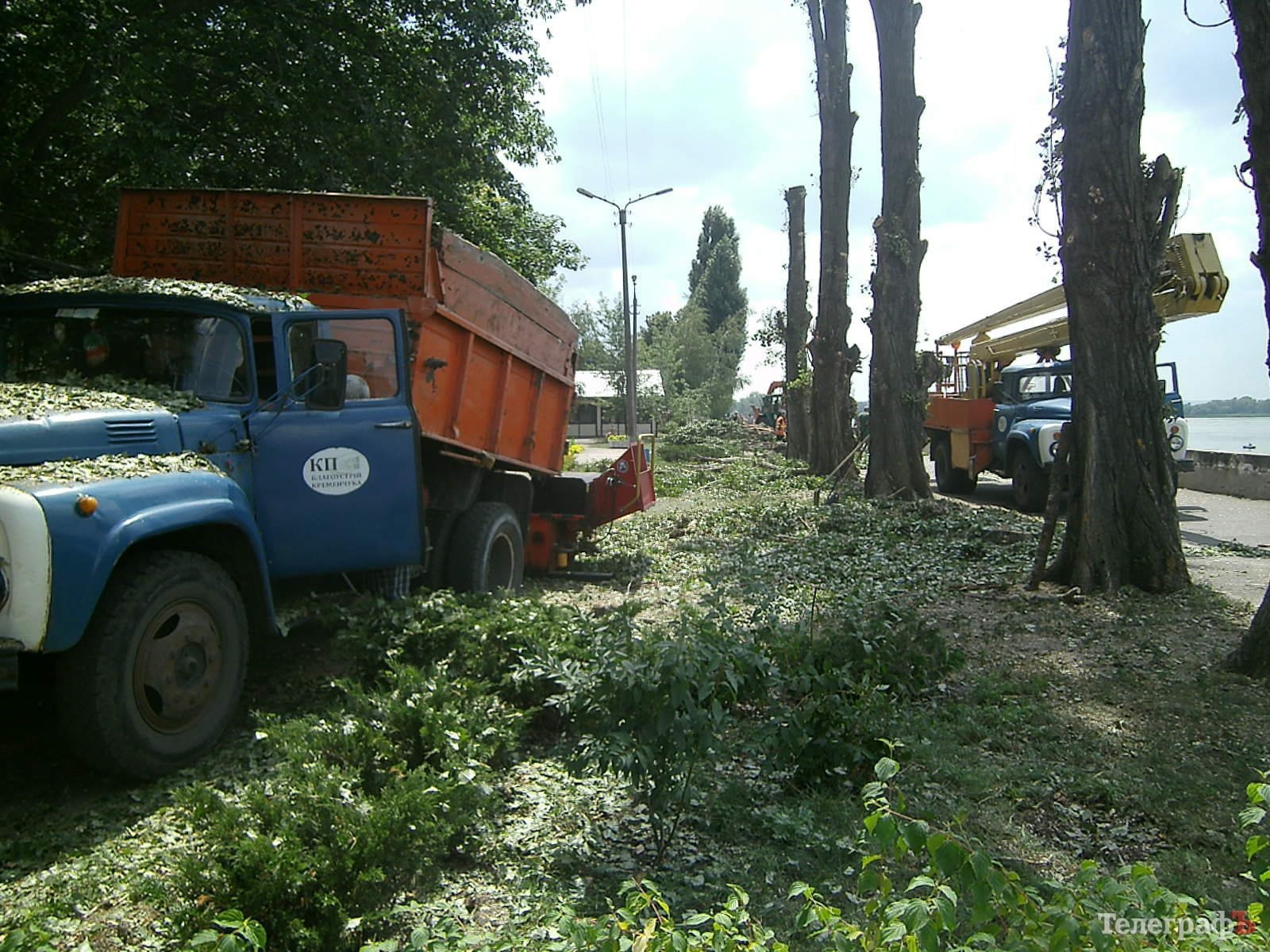 Спершу комунальники завантажували величезні гілки на машини. та 24-го пригнали шредер, аби на місці подрібнювати деревину и завантажувати її більш компактно та скоротити кількість перевезень.