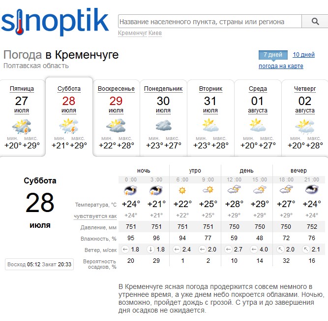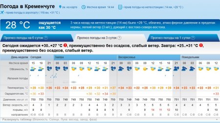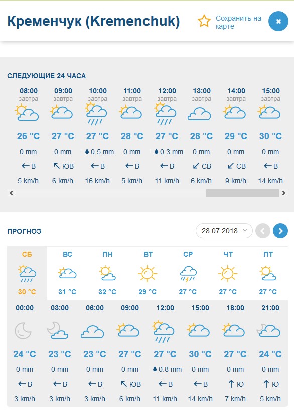 Ventusky обіцяє кременчужанам дощ у суботу, 28 липня, зранку та до обіду і суху, але похмуру неділю, 29 липня. Повітря, за їх прогнозом, прогріється до +31°C.