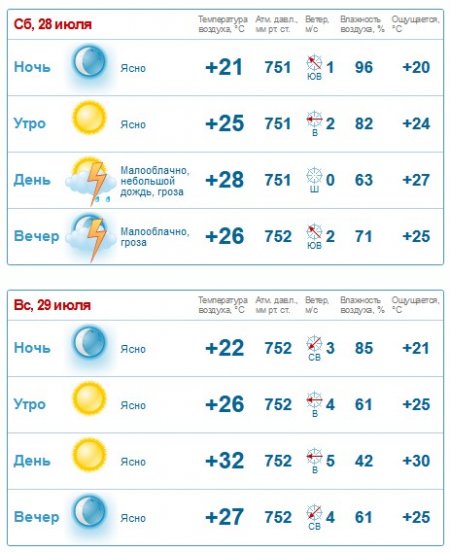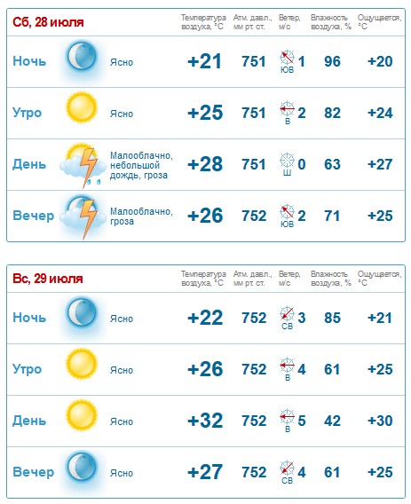 Rp5 на суботу, обіцяє, що ранок суботи, 28 липня, почнеться зі зливи та туману з видимісю менше 1 км. У неділю, 29 липня, під вечір можливий невеликий дощ та посилення поривів вітру до 14 м/с. Температура повітря коливатиметься в межах +22°C...+31°C.
