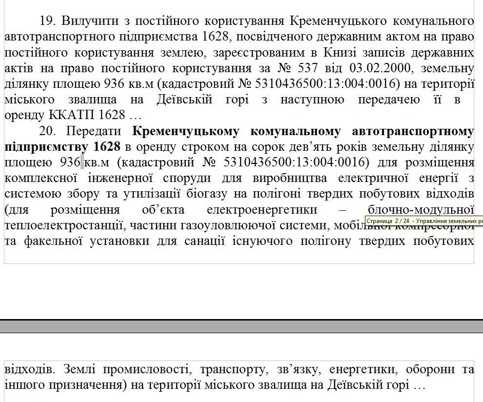 На сессию Кременчугского горсовета, которая состоится 9 августа хотят вынести дополнительный проект решения об аренде на 49 лет Деевской свалки для предприятия КАТП 1628. Затем КАТП предоставит в субаренду участок площадью 936 кв м ТОВ «Кліар Енерджі Кременчук», которое осуществляет хозяйственную деятельность на свалке — вырабатывает электроэнергию из биогаза и продает в сеть. Опять-таки, речь идет о субаренде на 49 лет.