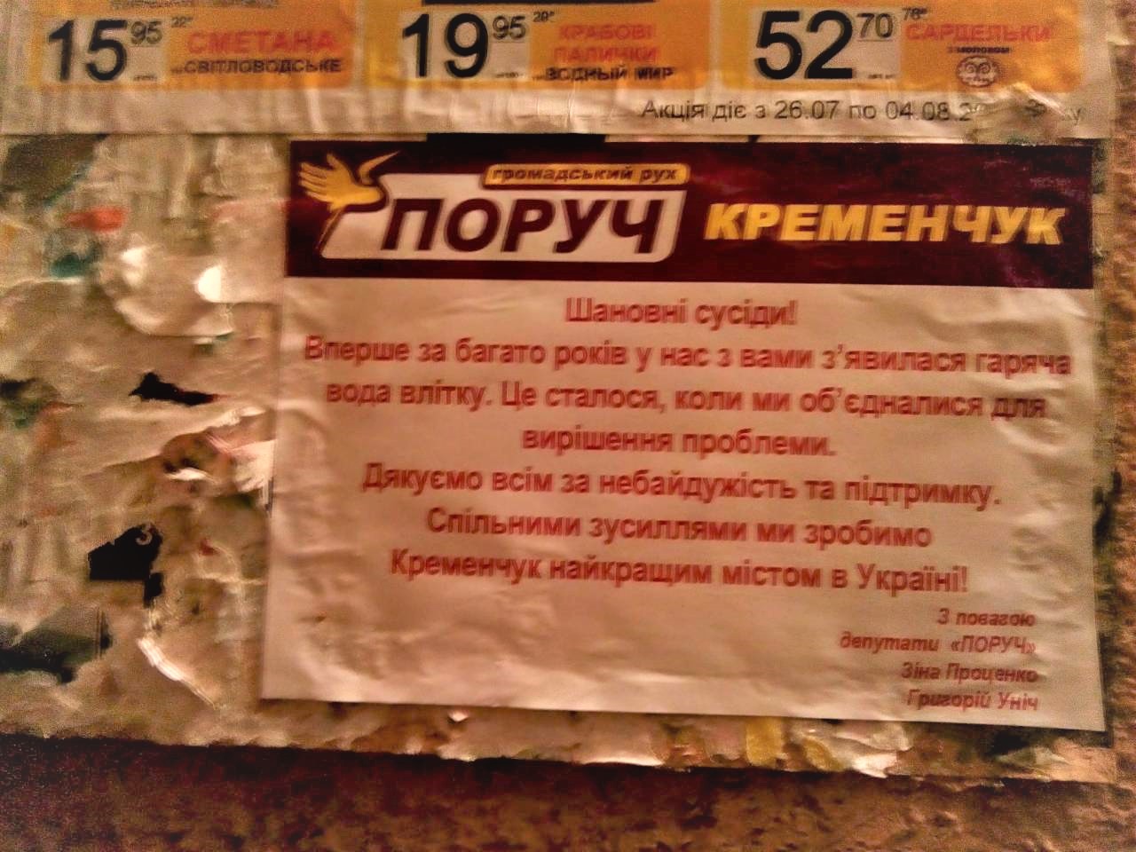 О чём думали люди, которые клеили или давали задание наклеить данную листовку на этот дом? Мало того, что участие в «победе» членов партии «Поруч» достаточно сомнительное (городской голова, а «Поруч» – его партия, долго упирался требованиям депутатов с Раковки), так и воды ж горячей в доме с «победной листовкой» нет...