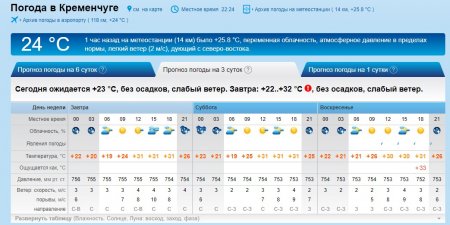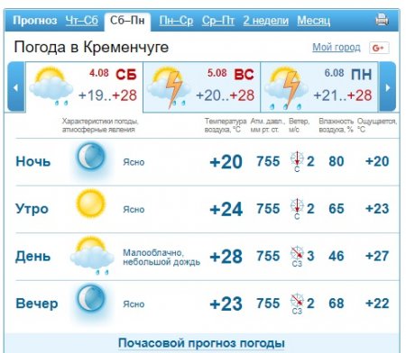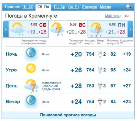 А от gismeteo прогнозує у суботу для кремечужан ввечері невеликий дощик, а в неділю - грозу.