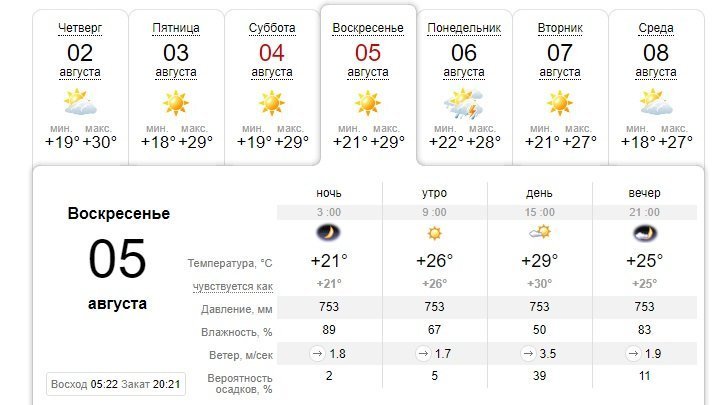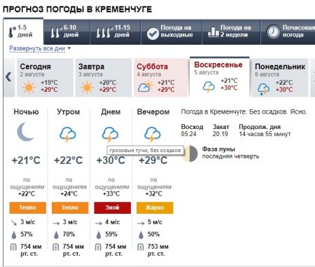 Без дощу в суботу за даними meteoprog температура прогріється до +29°C. З грозовими хмарами, але без опадів у неділю, 5 серпня.