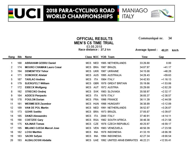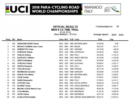 У другий день змагань 3 серпня Єгор Дементьєв в нозології МС5 змагався в індивідуальній гонці на швидкість (дистанція 27,2 км). Кремечуцький спортсмен завоював бронзову медаль паралімпійського чемпіонату світу, показавши час на дистанції - 34 хвилини 15,08 секунди. Переможцем на цій дистанції став Даніель Абрахам Гебру з Голандії - 33.26,80, срібло за бразильцем Лауро Сезар Мауро Чаман - 34.07,97.