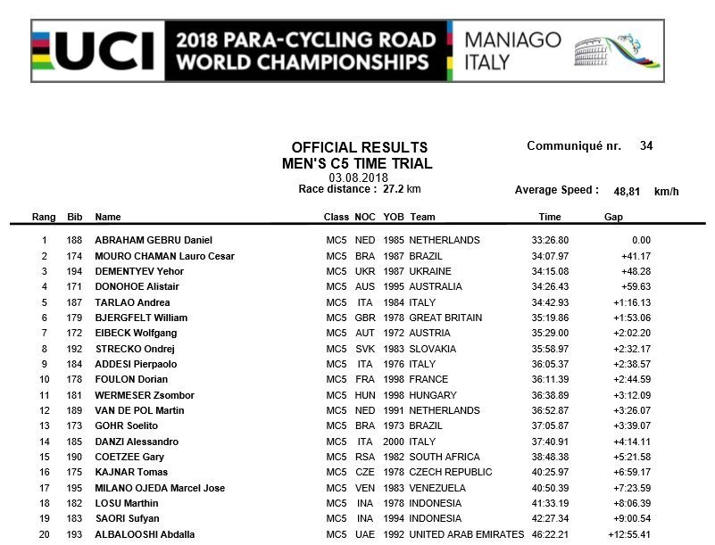 У другий день змагань 3 серпня Єгор Дементьєв в нозології МС5 змагався в індивідуальній гонці на швидкість (дистанція 27,2 км). Кремечуцький спортсмен завоював бронзову медаль паралімпійського чемпіонату світу, показавши час на дистанції – 34 хвилини 15,08 секунди. Переможцем на цій дистанції став Даніель Абрахам Гебру з Голандії – 33.26,80, срібло за бразильцем Лауро Сезар Мауро Чаман – 34.07,97.