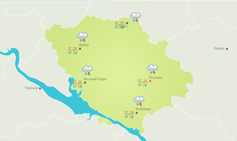 За даними Українського гідрометеорологічного центру опади накриють Полтавщину в понеділок та вівторок, а далі до кінця тижня буде сонячна погода. Температура повітра коливатиметься +25.. 29оС, а вночі температура опуститься до 13оС.