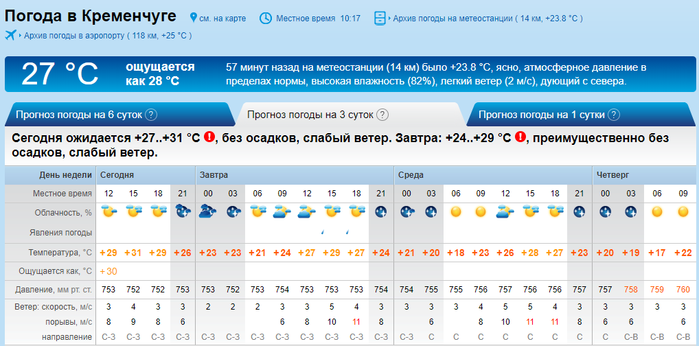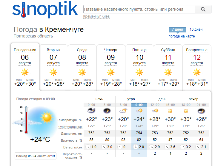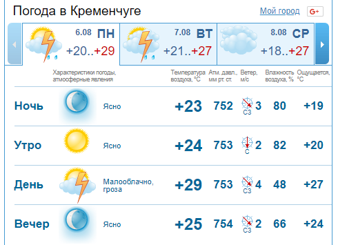 А от sinoptik для кременчужан не передає дощу. У перші два робочих дні до обіду в Кременчуці протримається похмура погода, а у другій половині дня небо проясниться. Без опадів. Середина на кінець робочого тижня радуватиме сонячною погодою, температура підніметься лише до +28оС.