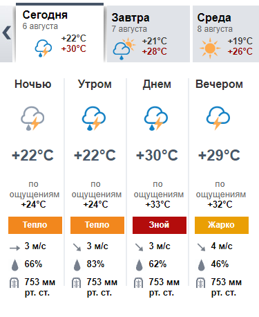 Мeteoprog також передає зливу. Хоч температура на термометрах буде показувати +22… +29о С відчуватиметься через наближення дощового циклону – аж до +33оС.