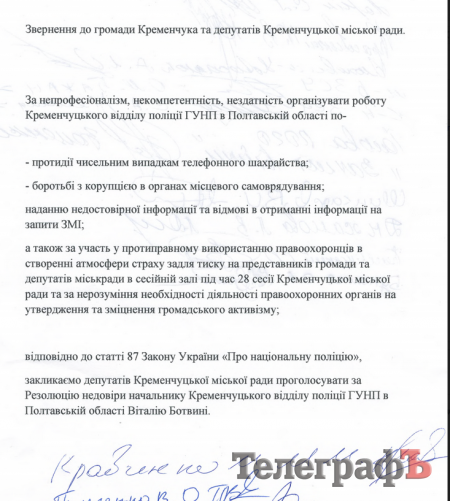 Группа кременчугских общественных активистов подписала резолюцию недоверия начальнику кременчугской полиции Виталию Ботвине. «ТелеграфЪ» получил текст резолюции с подписями её инициаторов.