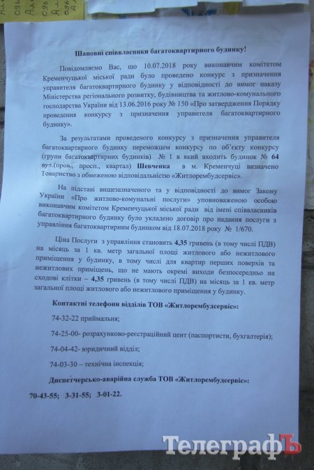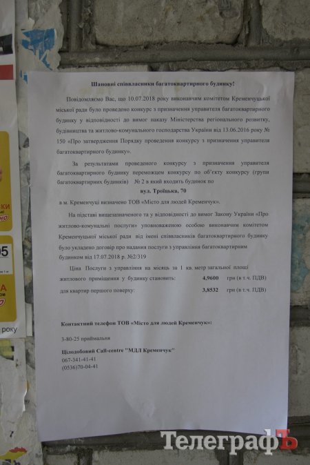 Управляющие компании «Житлорембудсервис» и «Місто для людей» развесили на подъездах домов объявления о новой стоимости своих услуг на управление этими домами. В объявлениях сказано, что исполком провел конкурс на управление многоквартирными домами, с каждой из компаний 17 июля заключен договор как с победителем конкурса.