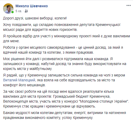 Депутат Кременчуцької міської ради Микола Шевченко від партії "Поруч" склав депутатські повноваження. Про це він повідомив на своїй сторінці у фейсбук.
