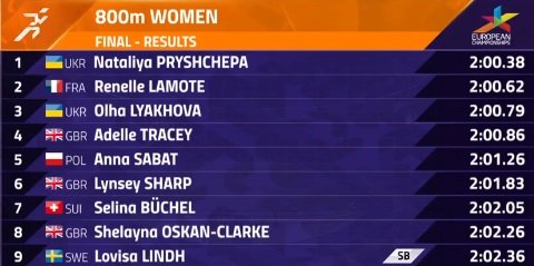 Переможниця Наталія Прищепа запам'ятається не лише тим, що стала першою в історії атлеткою, яка двічі поспіль виграла чемпіонат Європи на 800 м. В забігу за вихід до півфіналу Наталія фінішувала першою, але замість того, щоб святкувати перемогу вона допомогла суперниці фінішувати.
