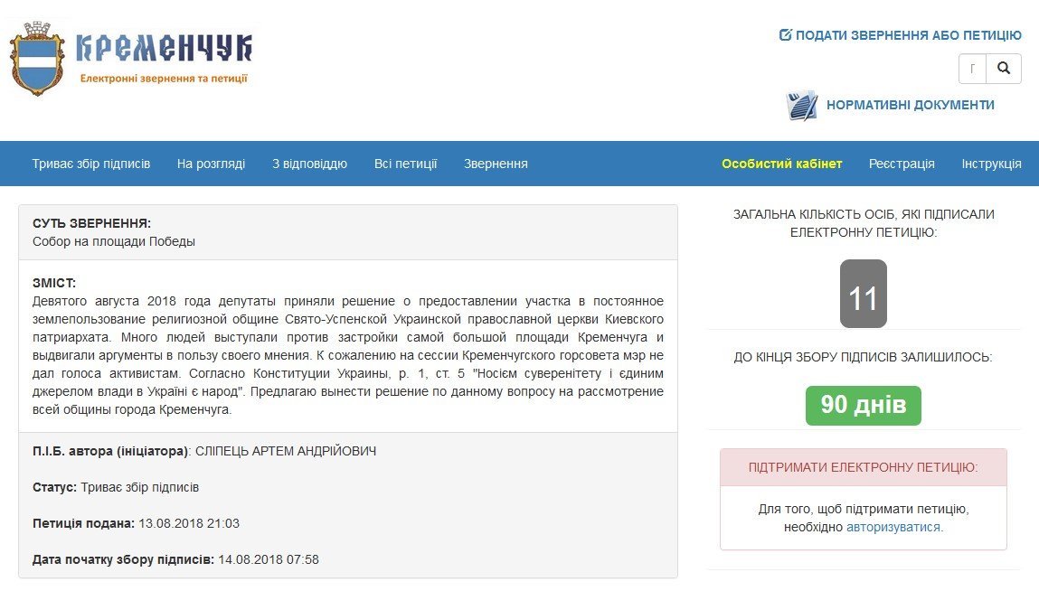 Депутаты приняли решение о предоставлении участка в постоянное землепользование религиозной общине Свято-Успенской Украинской православной церкви Киевского патриархата на сессии Кременчугского горсовета 9 августа. «За» был отдан 31 голос.
