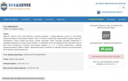 14 серпня на сервісі подачі електронних петицій Президенту України з'явилося одразу три звернення проти будівництва собору на площі Перемоги в Кременчуці. Автор всіх трьох - кременчужанка Тетяна Мироненко. Для їх рогляду доведеться назбирати аж 25 000 підписів.
