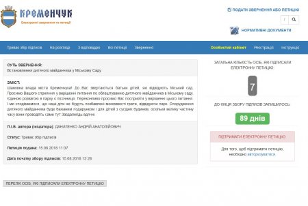 15 серпня на сервісі електронних петицій мерії з'явилось чергове звернення до мера Кременчука Віталія Малецького. Кременчужанин Андрій Даниленко просить міського голову посприяти в облаштуванні дитячого майданчика в «Міському саду».