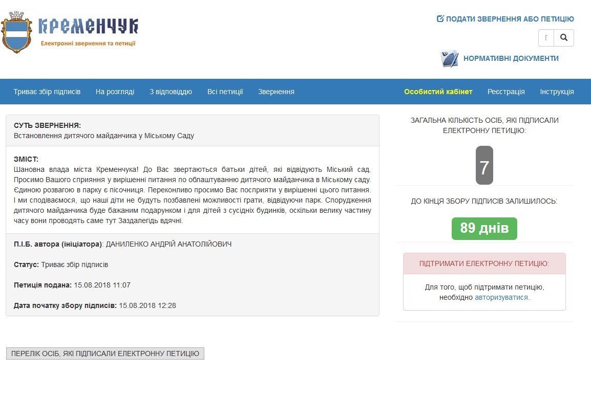 15 серпня на сервісі електронних петицій мерії з’явилось чергове звернення до мера Кременчука Віталія Малецького. Кременчужанин Андрій Даниленко просить міського голову посприяти в облаштуванні дитячого майданчика в «Міському саду».