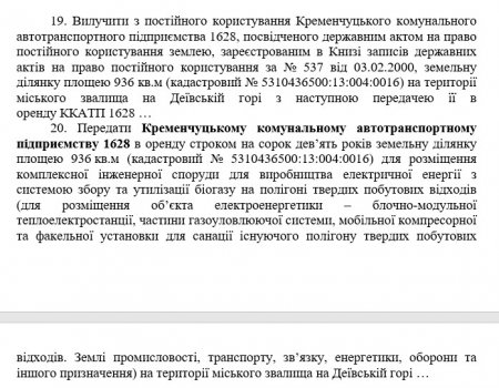 Решением сессии Кременчугского горсовета от 9 августа участок земли на Деевской свалке площадью 936 кв м изъят из постоянного землепользования КАТП 1628 – предприятия, которое содержит полигон отходов. Этому же предприятию участок передан в аренду «для размещения комплексного инженерного сооружения для производства электрической энергии с системой сбора и утилизации биогаза на полигоне твердых бытовых отходов». Земля передается в аренду с правом субаренды. Оборудование на участке уже стоит. И это оборудование принадлежит не коммунальному КАТП 1628, а ООО «Кліар Енерджі Кременчук» - легко понять, кому предназначена субаренда, хотя название фирмы в решении не указано. Но оно звучало на заседании депутатских комиссий и на сессии.