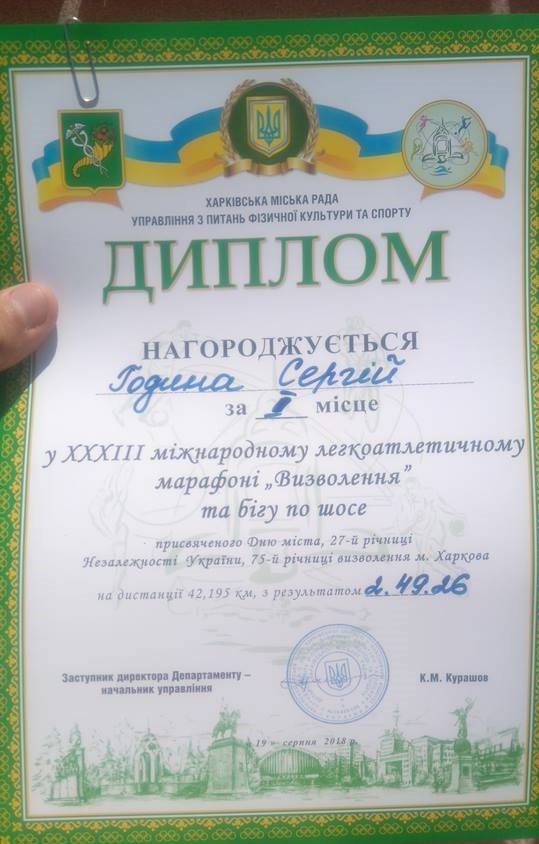 На цьому марафоні кременчужанин бере участь 7-й рік і серед своїх 21 офіційного марафону, вдруге в Харкові в особистому заліку піднявся на п'єдистал на 1 місце в категорії Ч20-39 і 4-е місце в абсолюті. Сергій фінішував з результатом - 2:49:26.