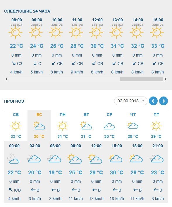 За прогнозом Ventusky, у суботу, 1 вересня, буде ясно та гаряче – аж до +33°C. У неділю, 2 вересня, небо захмариться і градус трохи спаде – до +30°C.