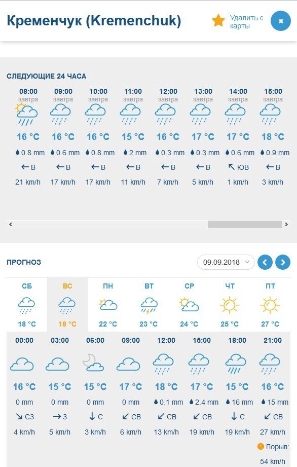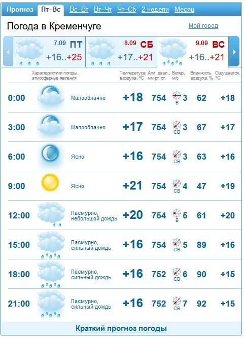 За прогнозом Gismeteo, у суботу, 8 вересня, цілий день йтиме невеликий дощ. У неділю, 9 вересня, пообіді почнеться справжнісінька злива. Температурний максимум на вікенд – +21°C.