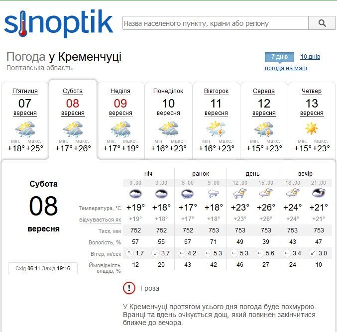 Sinoptik попереджає про можливу грозу у суботу, 8 вересня. Протягом усього дня погода буде похмурою. Вранці та вдень очікується дощ, який повинен закінчитися ближче до вечора. Повітря прогріється до +26. У деділю, 9 вересня, з середини дня і до його кінця йтиме сильний дощ. Температура повітря спаде до +18°C.