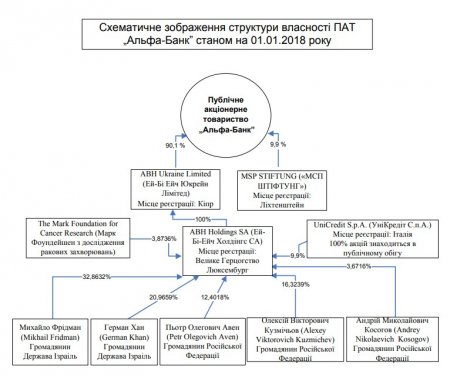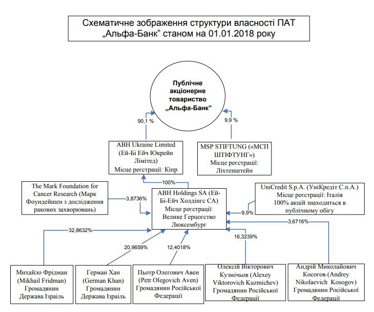 «Альфа-Банк» - банк с присутствием российского капитала. По классификации НБУ, он входит в группу банков иностранных банковсикх групп. По данным НБУ, самый крупный пакет акций (29,62%) принадлежит гражданину Израиля Михаилу Фридману (в интернете есть информация о нем как о российском бизнесмене, миллиардере с украинско-еврейскими корнями). Среди акционеров – еще один гражданин Израиля, трое граждан РФ, юрлица Лихтенштейна и Италии.