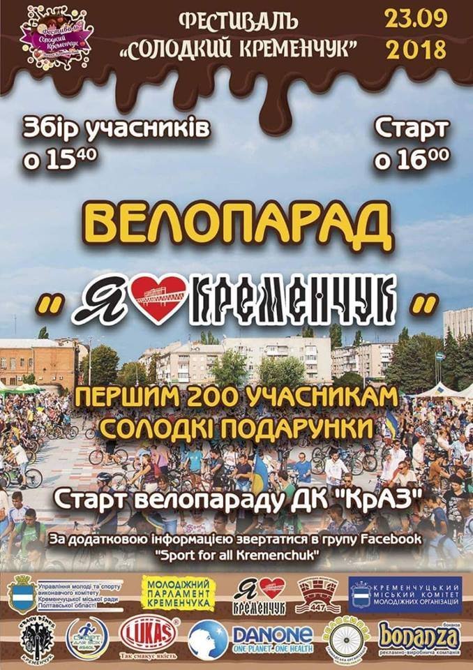 23 вересня о 16.00 велопарад від ДК «КрАЗ». Перші 200 учасників отримають солодкі подарунки.