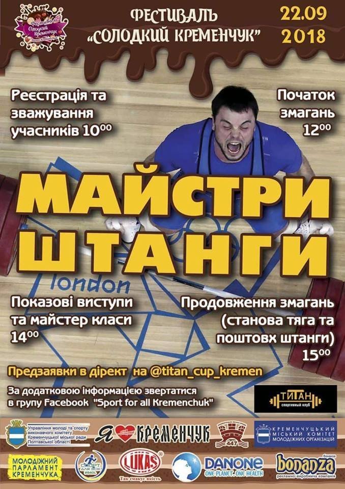 22 вересня о 12.00 площу Перемоги заполонять майстри штанги. Показові виступи та майстер класи розпочнуться о 14.00, а вже після перерви продовжаться змагання. О 15.00 змагання зі станової тяги та поштовх штанги.