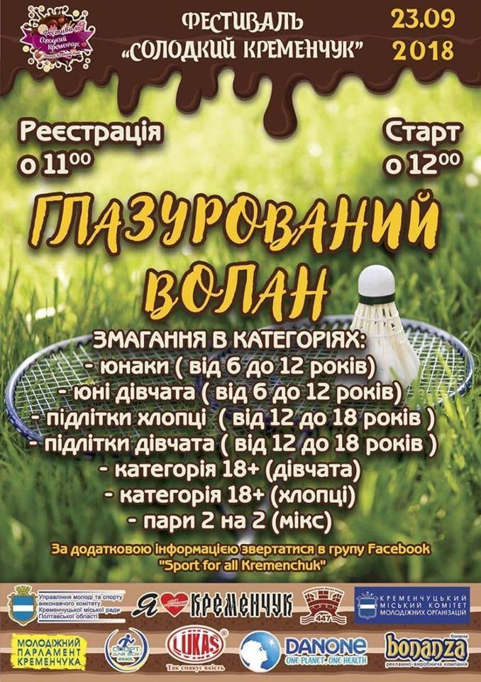 23 вересня о 12.00 розпочнеться турнір з бадмінтону «Глазурований вoлан». Реєстрація учасників з 11.00.