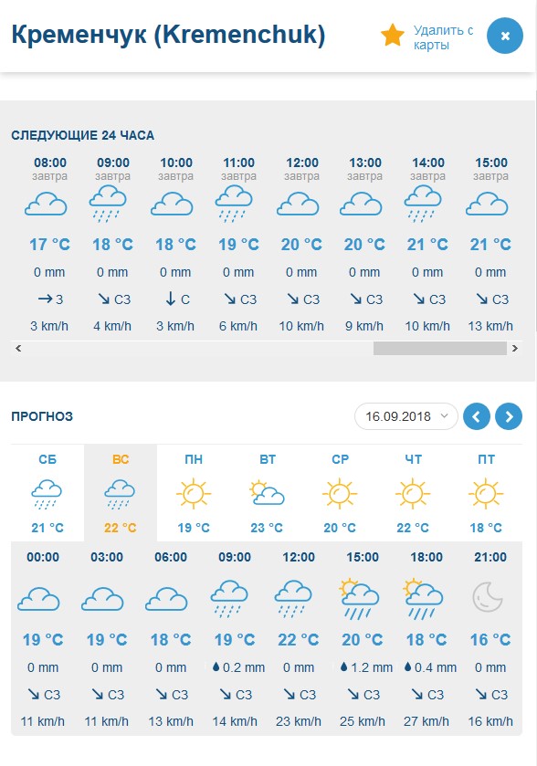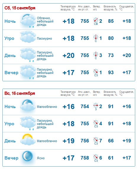 За прогнозом Gismeteo, у суботу, 15 вересня, цілий день йтиме невеликий дощ. У неділю, 16 вересня, дощ можливий зранку. Температурний максимум на вікенд - +20°C.