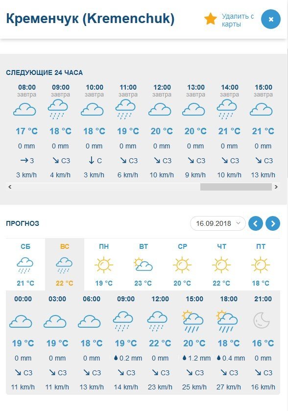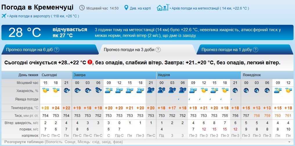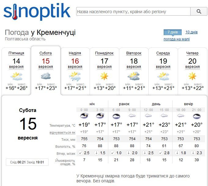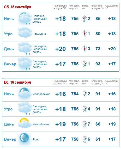 За прогнозом Gismeteo, у суботу, 15 вересня, цілий день йтиме невеликий дощ. У неділю, 16 вересня, дощ можливий зранку. Температурний максимум на вікенд – +20°C.