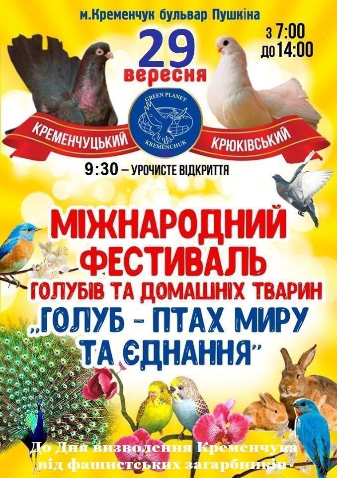 У суботу, 29 вересня на бульварі Пушкіна відбудеться традиційний Міжнародний фестиваль голубів, птахів та домашніх тварин «Голуб – птах миру та єднання», присвячений Дню визволення Кременчука від фашистських загарбників. Урочисте відкриття фестивалю відбудеться о 9:30.