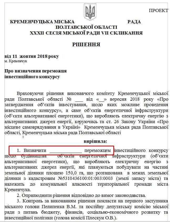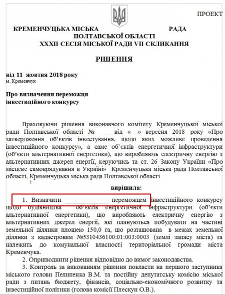 На сессию Кременчугского горсовета вынесен очередной «проект» решения о победителе инвестиционного конкурса в Кременчуге на право строительства объекта альтернативной энергетики на так называемом «Поле чудес» - земельном участке площадью 150 га, оставшемся от ликвидированного индустриального парка «Центральный».